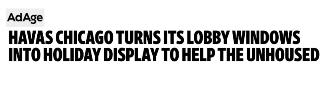 Havas partnered with The Night Ministry, a local NPO that specialized in meeting unhoused Chicagoans where they are, offering clothes, medical evaluations, and food. Our holiday window depicted the local snowy area with three purple coats suspended in front, encircled by the words “ share more than warm, wishes”. A Qr code on the window led visitors to the donation page where they could donate enough money for “new clothes”, “a week of groceries”, or “a new coat”.